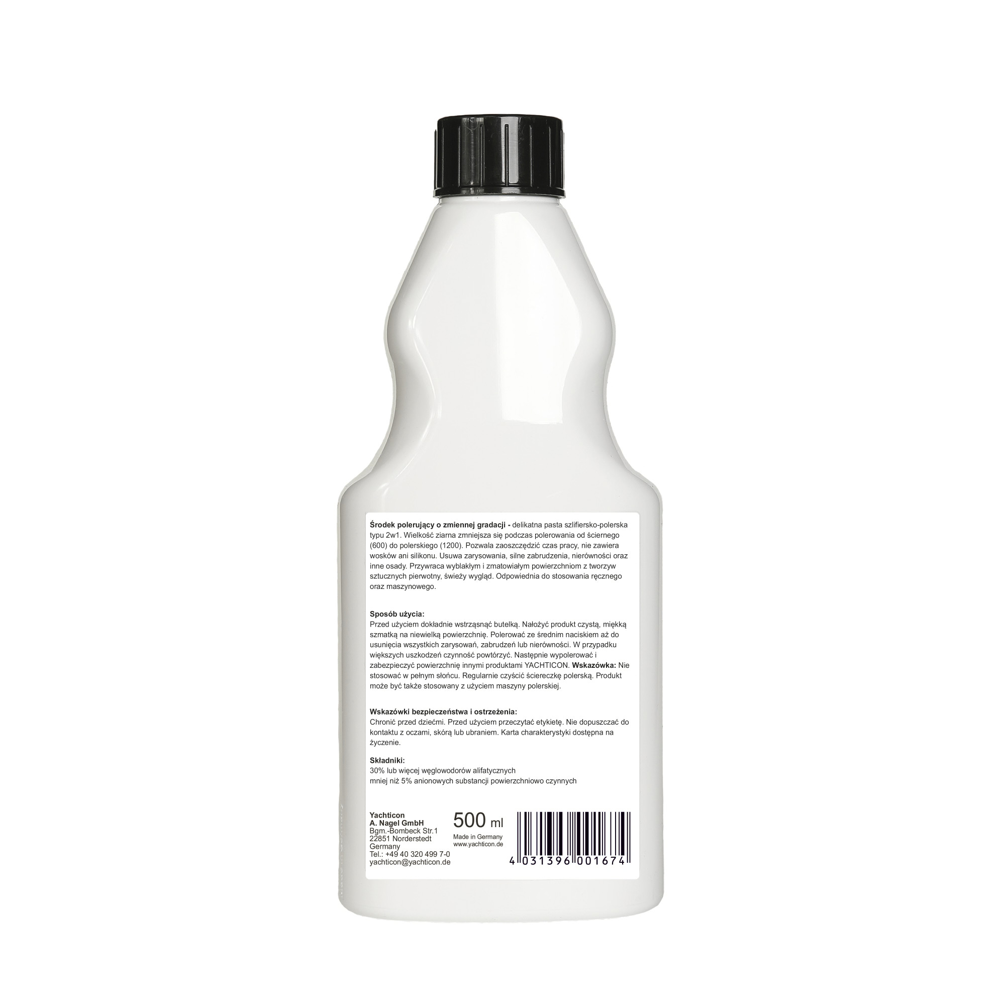Wyjątkowy, delikatny środek polerski o zmiennej gradacji. Ścieranie i polerowanie w jednym produkcie. Podczas procesu polerowania ziarna zmniejszają granulację z rozmiaru 600 do rozmiaru 1200 co pozwala zmatowić i wypolerować powierzchnię w jednym procesie. Bez wosku i silikonu. Usuwa zadrapania, zabrudzenia, nierówności i zanieczyszczenia. Wyblakłe i skredowane powierzchnie żelkotu lub farby ponownie wyglądają jak nowe. Bardzo łatwy w aplikacji może być polerowany ręcznie.