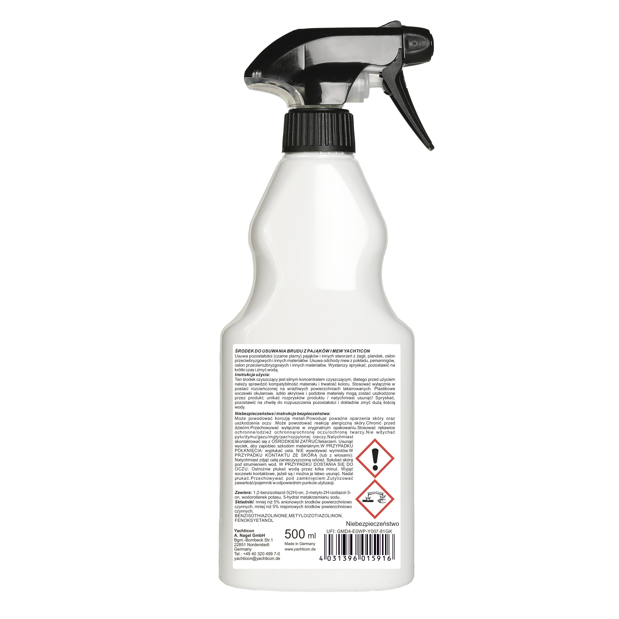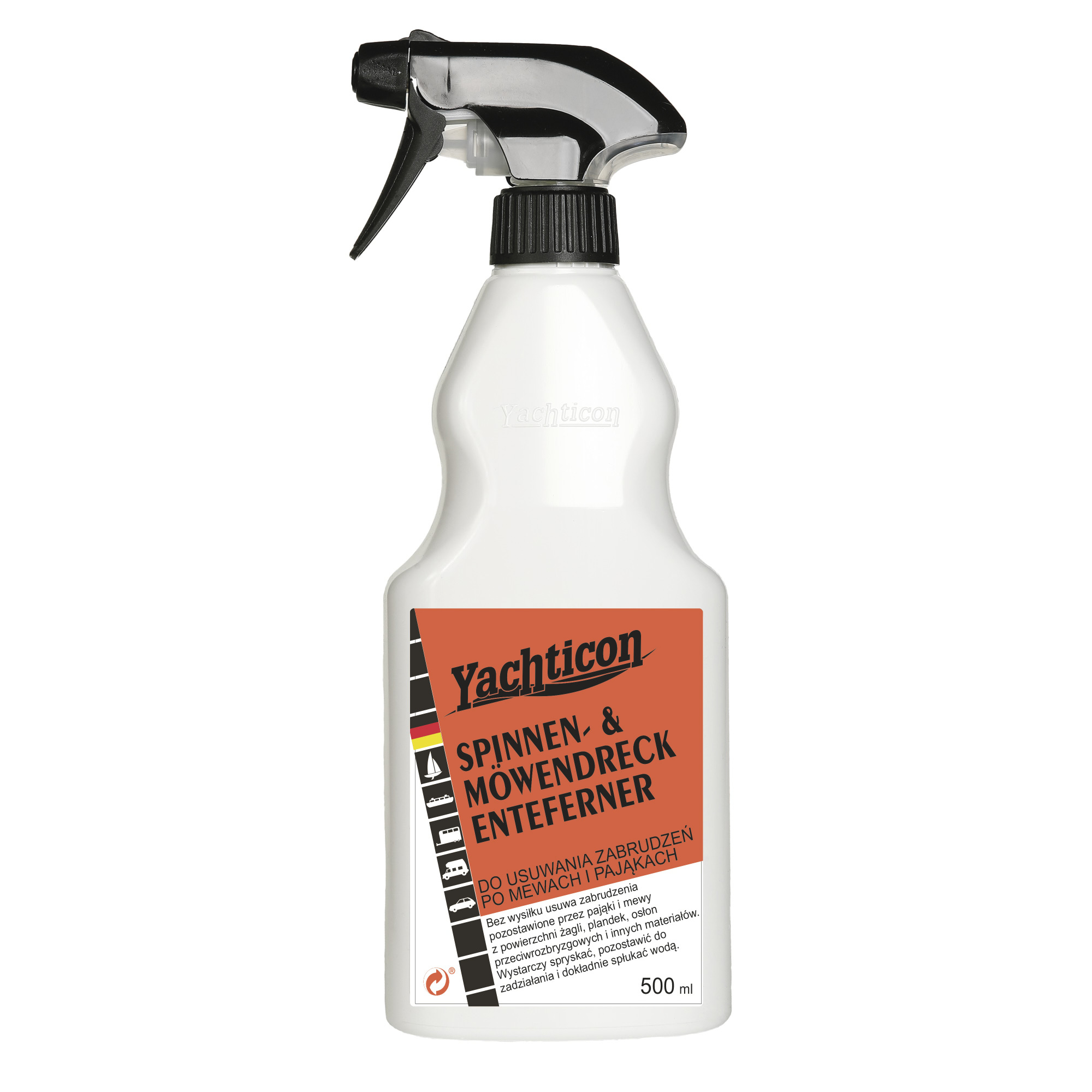 Skuteczny środek do usuwania odchodów mew i pajęczaków (czarne kropki). Może być stosowany zarówno na wszystkie twarde materiały jak i na żagle, pokrowce, tenty, plandeki i inne materiały. Bardzo łatwy w użyciu i bezpieczny dla każdego materiału.