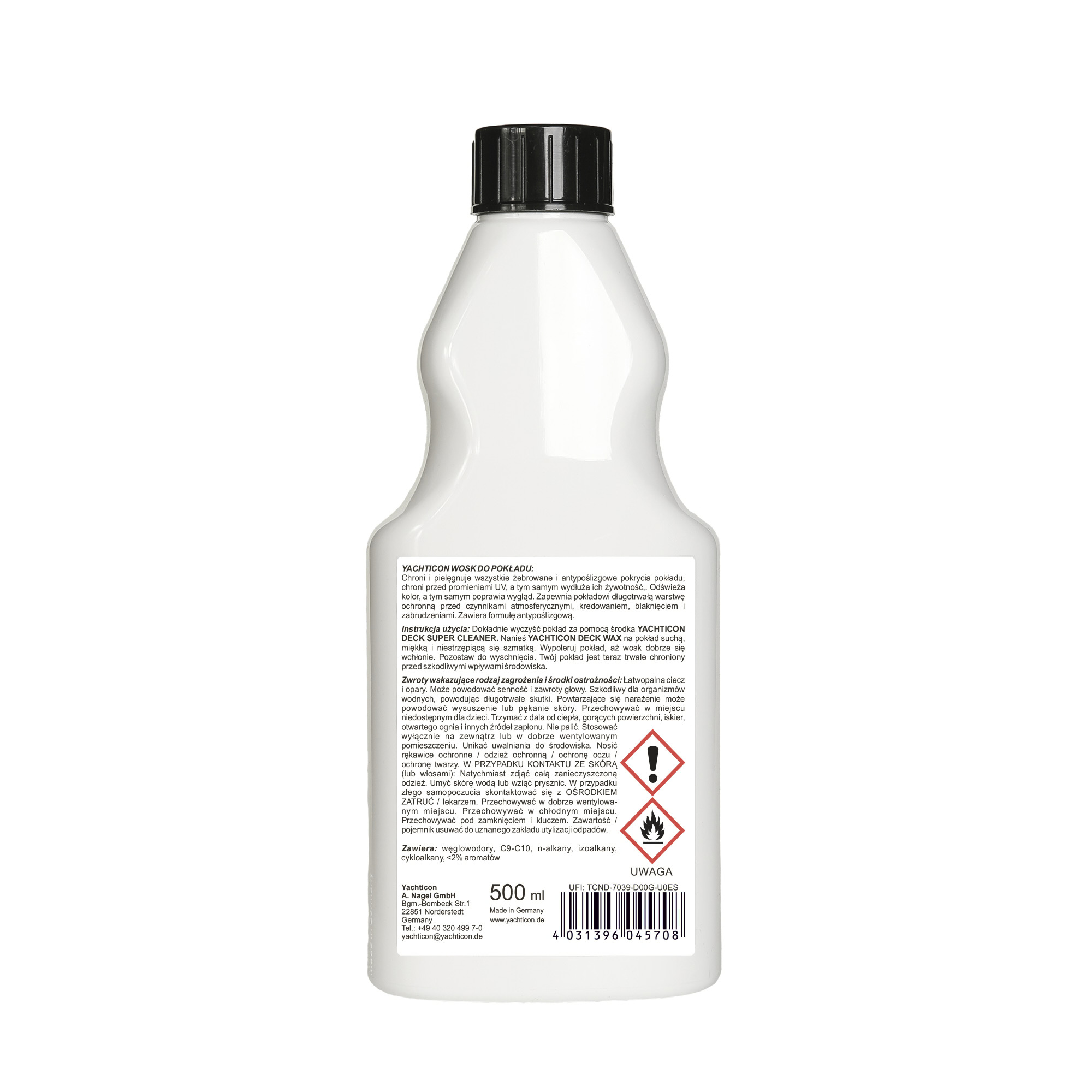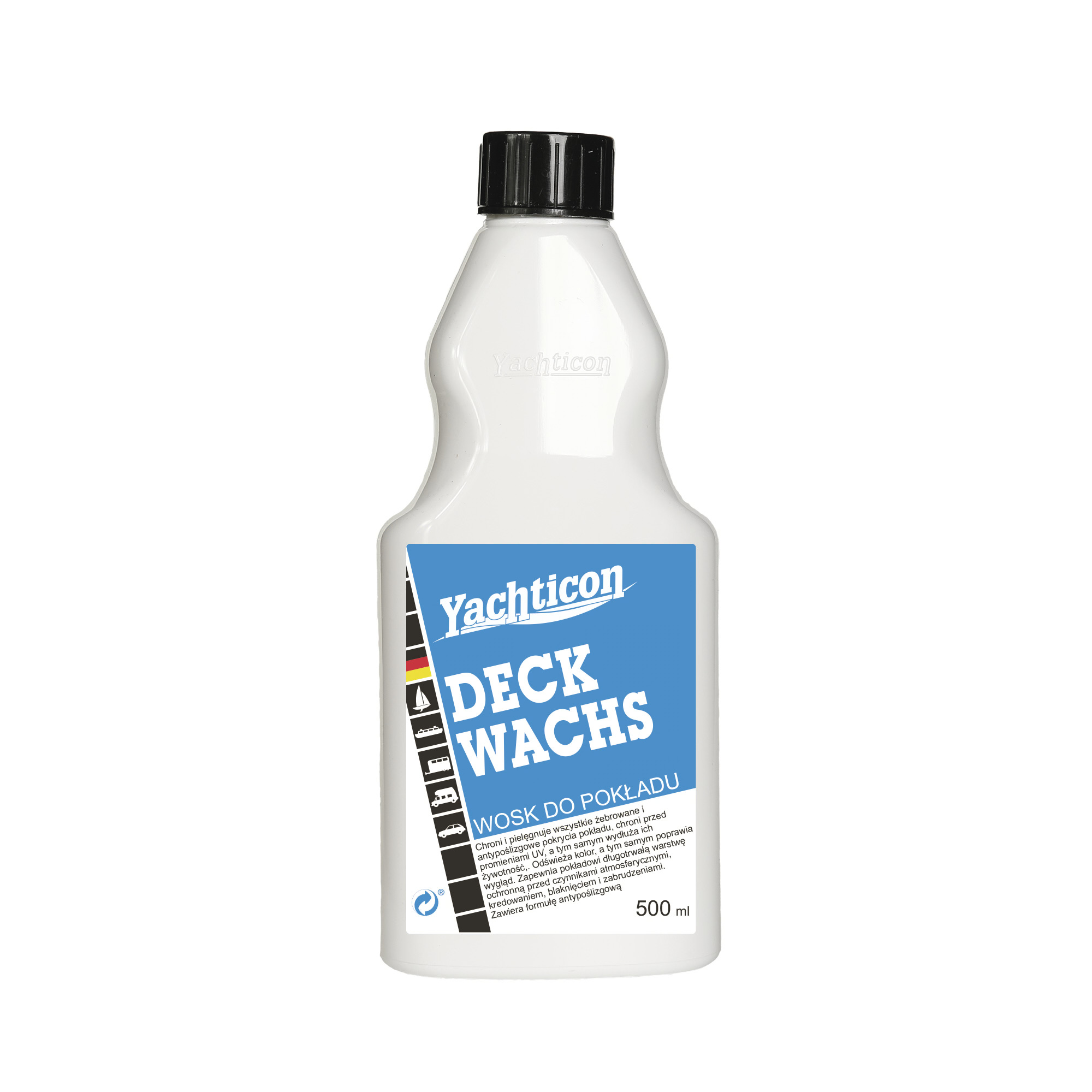 Yachticon Decks Wachs – produkt do zabezpieczania powierzchni antypoślizgowych (tzw. traków) na pokładach. Zabezpiecza pokład przed brudem, olejem, sadzami, działaniem czynników atmosferycznych, wody słodkiej i słonej oraz promieniowaniem UV. Wzmacnia właściwości przeciwpoślizgowe. Rozjaśnia kolory i poprawia wygląd pokładu.